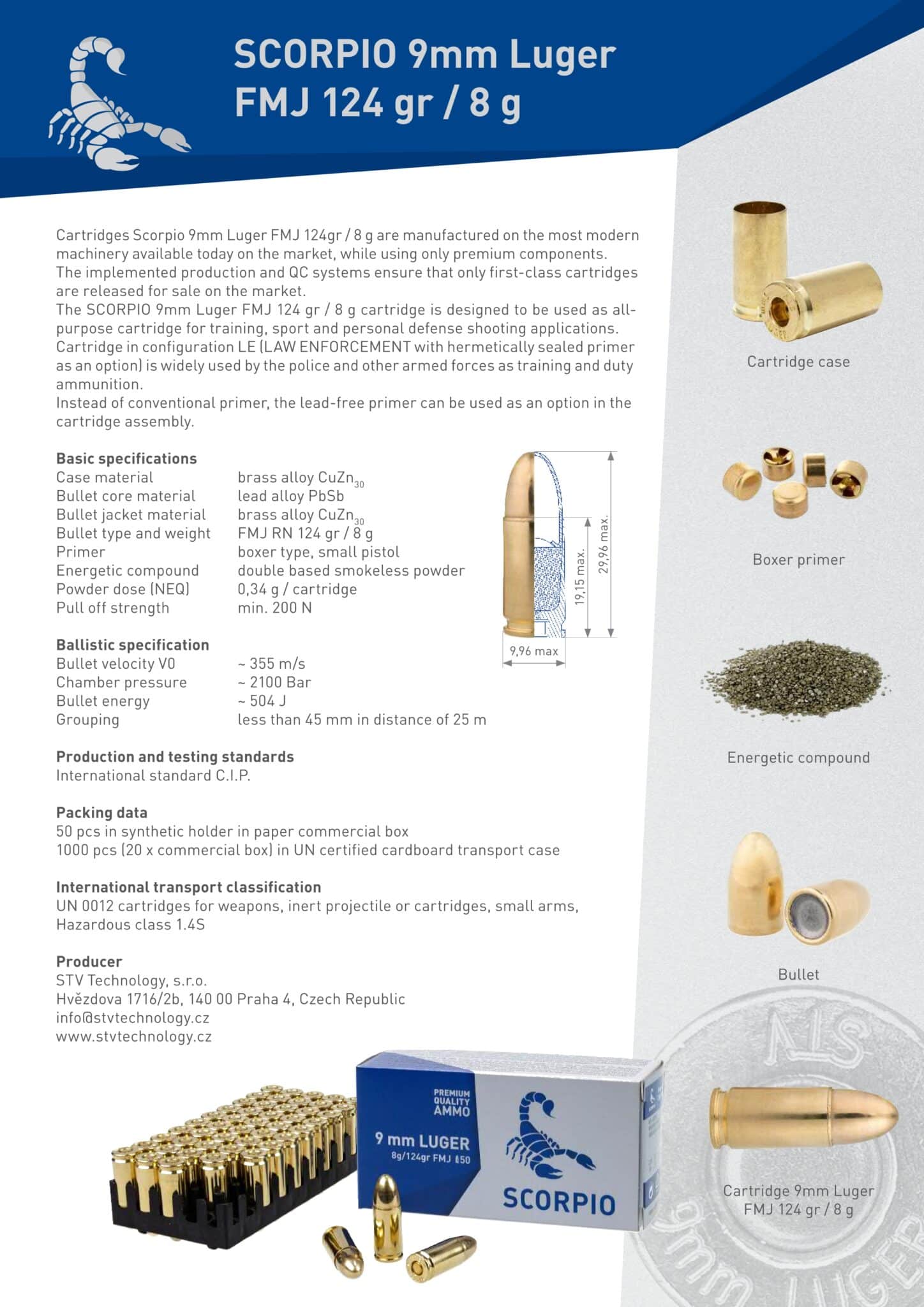 - 1x STV GROUP, SCORPIO, 9mm Luger, FMJ, 8,0g/124grs., 50Stk.