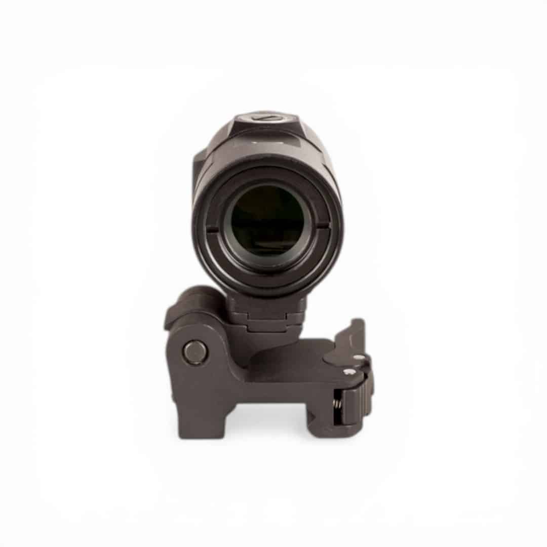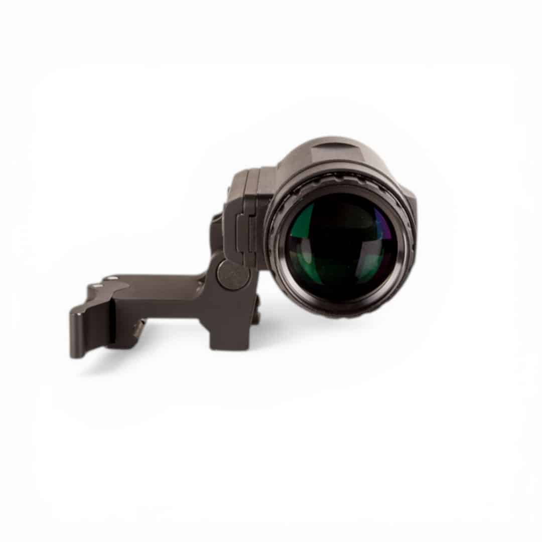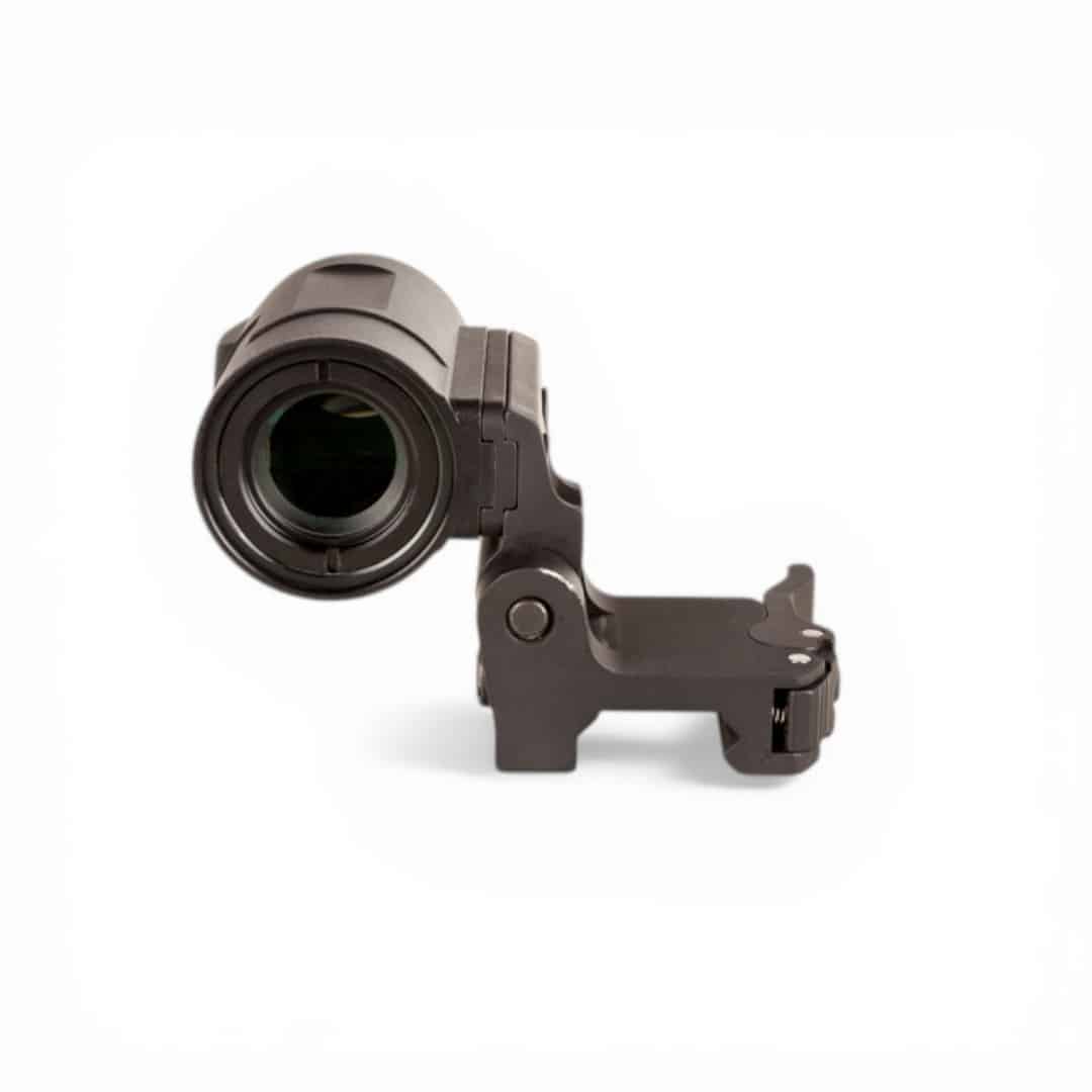 Die inkludierte Flip-to-Side-Montage mit Schnellverschlusshebel lässt sich per Hand oder Stoß seitlich ausklappen, passend zu Picatinny-Schienen. Einstellbare Positionierung gewährleistet perfekte Ausrichtung mit dem MRO SD oder HD-Visier. Augenabstand von rund 66 mm und ein Sichtfeld von etwa 7,2 Grad bieten komfortables Beobachten.
